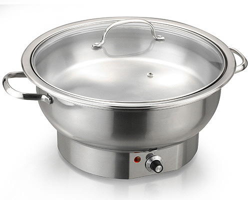 Deze heater heeft een glazen deksel en de ronde vorm geeft een